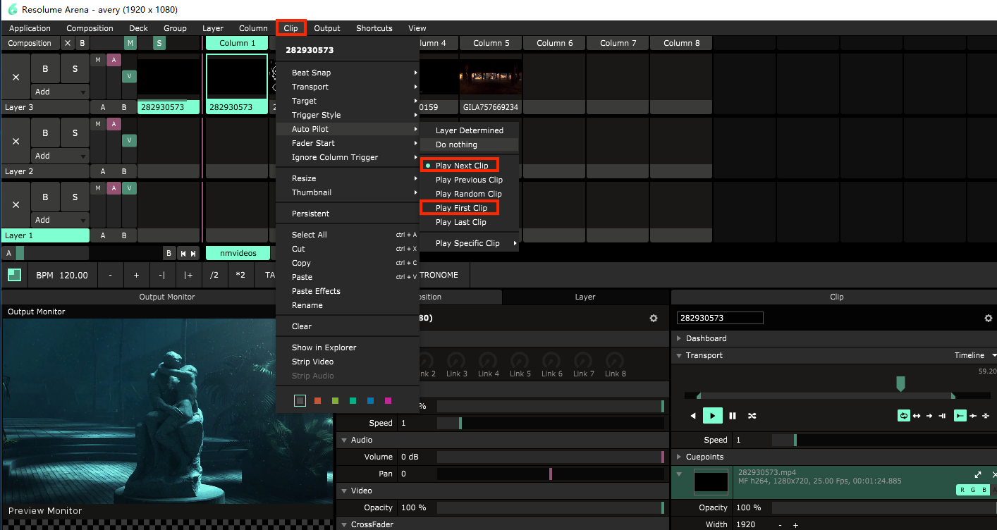 所添加视频默认会进行单视频循环,如需循环到下一个视频选择相应视频,然后点击菜单栏 Clip>Play Next Clip,最后一个视频可选择Clip>Play First Clip 已进行循环播放